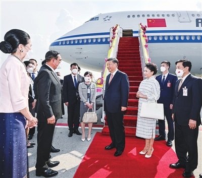习近平和夫人彭丽媛乘坐的专机抵达曼谷素万那普国际机场时,泰国总理巴育夫妇、副总理兼外长敦夫妇、文化部部长伊提蓬夫妇等热情迎接。礼兵分列红地毯两侧,身着靓丽民族服装的当地青年行合十礼夹道欢迎,泰国华侨华人代表挥舞中泰两国国旗,向习近平夫妇表示最热烈的欢迎。