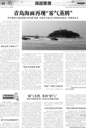 “青岛大海又冒烟儿了”“像是蒸馒头一样”“这种现象可能叫‘海浩’吧”……11月30日早晨,有市民发出青岛近海部分区域的海面上飘逸雾气的照片及视频,早报记者当天在栈桥景区看到,栈桥及小青岛周边海面上确有一层薄雾流动,就像海水在冒热气一样,海面上停泊的船只以及回澜阁、小青岛等都被笼罩在雾气中。这种现象在去年1月7日也曾出现过,当时根据气象专家的解释,这种现象叫“海浩”。当天,早报记者采访中国海洋大学海洋气象学系海雾研究团队了解到,这种现象在我国北部近海及俄罗斯、日本等海域常发,学名应该叫平流蒸发雾(或蒸汽雾),“海浩”的称呼可能是来源于大连的民间说法。