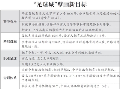 11月30日,青岛市足球改革发展推进工作领导小组发布了《青岛市“十四五”时期全国足球发展重点城市建设方案》,明确规划了青岛将积极申办世俱杯、世界杯等重大国际赛事,年度各级各类足球赛事不少于5000场,全市经常参与足球活动的人数达到80万等发展目标。