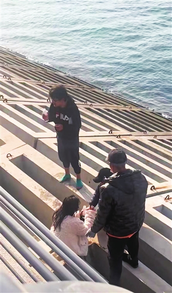 “等把落水女子的上半身拉出水面后,我俩慢慢晃着她,直到她吐出了很多海水。吐出水后,她脸上有了血色,呼吸也变得均匀了,我俩才放心了。”单志强说,后来很多热心市民赶到了现场,“我看岸上有人了,就赶紧喊人快来帮忙。”在附近单位工作的保洁人员栗祥辉听到后,迅速下到堤坝上。三人一块抬起落水女子,把她抬到离海边较远的堤坝斜坡上。