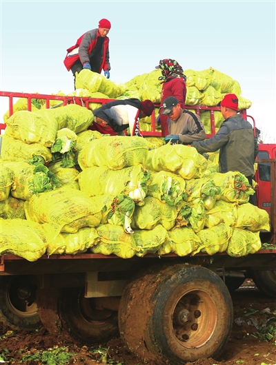 白菜地里,刘全洲和他的同伴们干得热火朝天,他们将一棵棵白菜挨个放倒,麻利地抱起三五个白菜径直走向大货车,由上面的菜农挨个放好码齐,不一会工夫,一辆大货车就满载出发了。