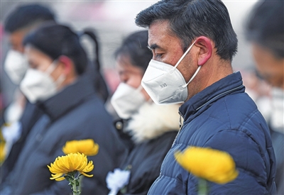在新疆乌鲁木齐市街头,群众肃立默哀。