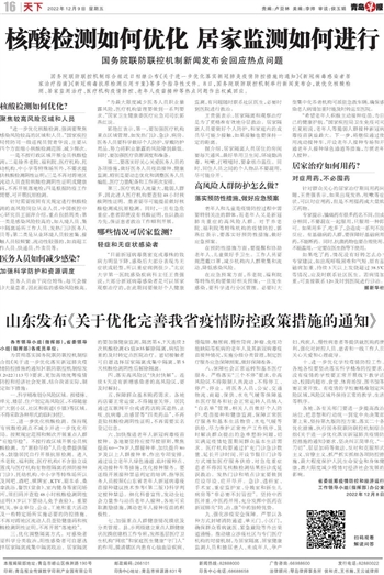 国务院联防联控机制综合组近日相继公布《关于进一步优化落实新冠肺炎疫情防控措施的通知》《新冠病毒感染者居家治疗指南》《新冠病毒抗原检测应用方案》等多个指导性文件。8日,国务院联防联控机制举行新闻发布会,就优化核酸检测、居家监测治疗、医疗机构疫情防控、老年人疫苗接种等热点问题作出权威回应。