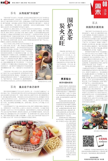 初冬的午后,南枝小馆里,几个年轻人围坐在炉火旁谈笑风生。小馆绿植蔓延院落四周,在冬阳的照射下,大家往炉火旁一凑,顿时心生暖意。“除了传统的红茶、绿茶、普洱外,还有果茶、奶茶、咖啡、红酒等。”经常和闺蜜光顾这里的林友妮说,以前她只是经常喝茶,如今已经变成了一位喜欢动手煮茶、烹茶、调茶的茶饮爱好者。“改造后的围炉煮茶,对‘茶’有所升级。”林友妮说,围炉煮茶颇有讲究,并不是所有的茶都能拿来一股脑地丢在壶里煮。比较适合煮的通常是一些年份茶,如普洱老茶、老白茶、老茶头和稍粗老的普洱茶“黄片”等;反之,鲜嫩至上的茶类,如绿茶就不适合煮。