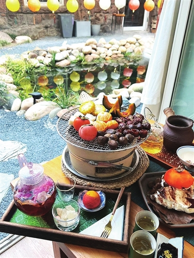 围炉喝茶时,拍照也特别“出片”。除了标配的炭炉和茶以外,用精致复古的器皿装成搭配色彩饱和的应季水果和各式点心,真的可以捕获人心。绿豆糕配绿茶、清油酥点配黄茶、瓜子坚果配乌龙、果脯蜜饯配红茶……各种青岛人爱吃的枇杷梗、核桃酥,整齐码在各种精致的陶瓷盘碟里。此外,还有专属冬季的地瓜、核桃、红枣、牛肉干等烤制茶点,要用“筲箕”或“笸箩”呈上,田园风便扑面而来。