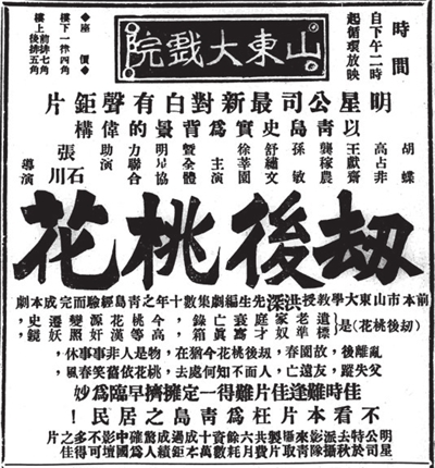 当日,山东大戏院在青岛时报、青岛民报等报纸刊布广告,“不看本片枉为青岛之居民!”因《避暑录话》与洪深结缘的青岛民报,亦在2月2日予以报道《青岛史实钜片“劫后桃花”今日在山东放映》,“明星公司之有声片《劫后桃花》,系本市山东大学教授洪深先生所编剧,该片以青岛为背景,写青岛历年不幸变迁史中之一段逊清遗老们的家庭没落史,主演者胡蝶、高占非、王献斋、龚稼农等,该公司为使剧情逼真起见,特于去秋来青摄取外景,举凡青岛之古迹名胜,如汇泉炮台、李村、沙子口等处,莫不一一摄入镜头跃登银幕,闻该公司为使青市观众早睹起见,特赶印全新拷贝一部,飞运来青。”