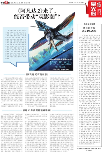 当年的观影潮能否在13年后再续?热爱电影的宋蕾信心十足:“我们的电影观众从未走远,好的电影作品永远都是市场上的刚需。”但是也有不少业内人士给出了不同的看法,他们在接受记者采访时坦言,现如今的电影票房期待一部影片救市的现象已经很难再现了,面对着《阿凡达2》的上映,并不能盲目乐观。他们指出,现如今“炫技”的电影大片层出不穷,观众对于影视视觉奇观的消费已成常规。不出所料,在超前点映场之后,就有不少影迷略感失落,“这种失落并不是说电影本身,而是13年前的第一部太过于惊艳,以至于在见识过这种震撼之后,第二部带来的冲击力要相对弱一些,这一次影院里观众‘哇’的声音要比第一部更少。”此外,剧情的走向也是影响风评的主要原因。在前作上映时,就有不少影评认为《阿凡达》的剧情并无创新之处,土著民与外来侵略者的对抗、大自然的神秘威力等也是常规话题;此外,流媒体带来的观影习惯,让不少观众逐渐减少了影院观影频率,转为线上点播。《阿凡达2》长达190分钟的时长,对于习惯了随时可以暂停的观众来说,能否在影院里“坚守”这么长的时间,也是一个考验。青岛一位影院从业者喜忧参半地对记者表示:“电影的时长长达三小时十分钟,这必然导致排片的场次较少,影院出于盈利需要,会相应提高票价。此外,受到疫情影响,还有不少观众并不愿意在此时走进影院,目前的预售数据也彰显出了这种观望心态,在上映初期,《阿凡达2》的票房数据保持着非常好的态势,但后续的增幅开始大幅放缓,第一部放映时万人空巷的场景基本不会再出现了,但其本身拥有着足够的吸引力,是一部适合走长线的影片。毕竟不止一部《阿凡达2》,之后即将到来的跨年档、贺岁档,都将为沉寂许久的电影市场注入一股活力。”
