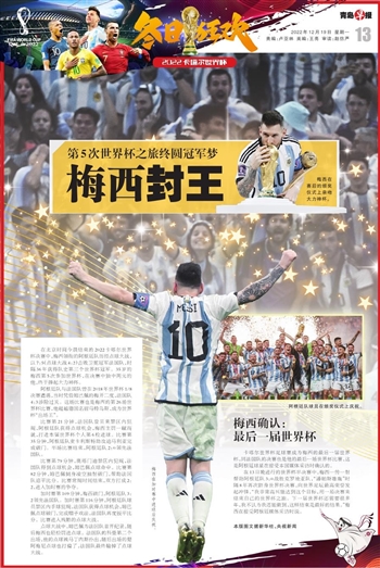 在13日晚进行的世界杯半决赛中,梅西一传一射帮助阿根廷队3:0战胜克罗地亚队,“潘帕斯雄鹰”时隔8年再次跻身世界杯决赛,向世界足坛最高荣誉发起冲锋。“我非常高兴能达到这个目标,用一场决赛来结束自己的世界杯之旅。下一届世界杯还需要很多年,我不认为我还能做到,这样结束是最好的结果。”梅西在接受阿根廷媒体采访时说。