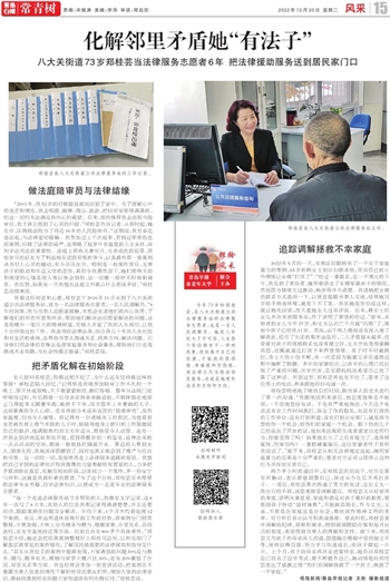 “2001年,我52岁的时候提前离岗回到了家中。为了排解心中的迷茫和惆怅,我去唱歌、跳舞、爬山、旅游,把时间安排得满满的,但这一切仍无法满足我内心的渴望。后来,组织推荐我去法院当陪审员,我才真正找到了心灵的归宿。”郑桂芸告诉记者,从那时起,她在市、区两级法院当了将近16年的人民陪审员。“这期间,我有幸走进法庭,与法律密切接触。我参加过上千次庭审,看到过形形色色的案例,目睹了法律的威严,也领略了庭审中有温度的人文关怀,深知学法用法的重要性。法庭上那些夫妻反目、兄弟成仇的场景,那些昔日的好友为了利益相互诋毁背叛的争斗,以及最终那一张张判决书对人心灵的撼动,至今历历在目。特别是一些案件背后,无辜孩子的眼泪和年迈父母的悲伤,真的令我潸然泪下,她们那种无助和绝望的心情是常人难以体会到的,这一切像一根针不时地刺痛我。我在想,如果有一天我能在法庭之外做点什么那该多好。”郑桂芸动情地说。
