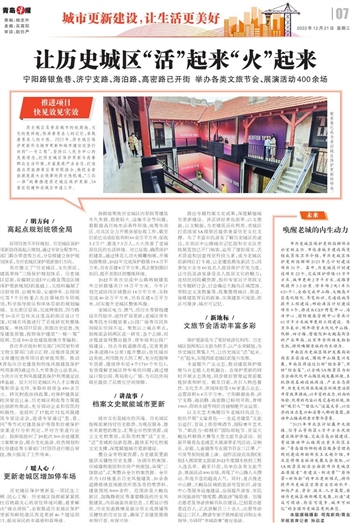 历史城区是青岛城市的起源地、文化的发祥地,传承着青岛人的记忆,承载着青岛人的乡愁。2022年,历史城区保护更新作为城市更新和城市建设攻坚行动的“一号工程”,坚持以人民为中心的发展理念,把历史城区保护更新与改善群众生活环境、丰富发展产业业态、打造高品质旅游景区等有机结合,抢抓全省旅游发展大会观摩的历史性机遇,“三位一体”统筹推进历史城区保护更新、5A景区创建和老城区申遗工作。