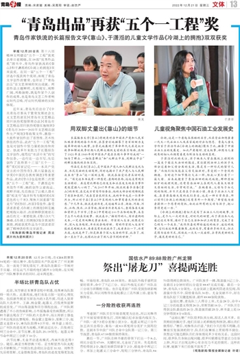 近年来,青岛先后出台了《中共青岛市委关于繁荣发展社会主义文艺的意见》《青岛市文艺精品项目扶持奖励管理办法》《青岛市文艺精品项目扶持奖励实施细则》《青岛市2020—2022年文艺精品创作生产规划》等政策文件,激励一大批作家创作出了思想性、艺术性俱佳的作品,此次“五个一工程”奖也是对创作中坚力量的扶持和肯定。铁流多年来致力于长篇报告文学创作,他笃信“生活中来”的写作信条,一边行走一边书写,先后创作了获得第十三届“五个一工程”奖《国家记忆——一本共产党宣言的中国传奇》、第六届鲁迅文学奖《中国民办教育调查》等重要作品,此次《靠山》也是他第二次荣获“五个一工程”奖。于潇湉近年来佳作不断,她的创作立意高远、视野开阔,先后推出了以载人潜水器“蛟龙号”海洋科考为题材的《深蓝色的七千米》、聚焦大国重器“雪龙号”的《你好,冰原》等佳作,备受读者喜爱。《冷湖上的拥抱》则是她把视线从海洋、冰原转移到地底石油后的又一重要收获。《靠山》大气巍峨,《冷湖上的拥抱》饱含真诚和真情,两部获奖作品为中国读者贡献了精神供给和文学滋养。