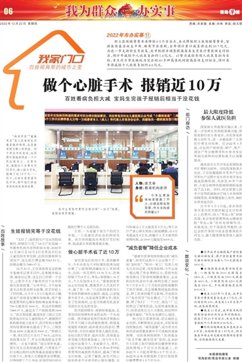 “病有所医”“健康青岛”是人民美好生活最直接的体现,也是最深情又暖心的牵挂。对于青岛市民来说,这份期许落地体现在一个个民生账本上。生育住院,报销后只自费支付50多元,做心脏大手术,报销了近10万元……近日,记者走进普通市民中间,倾听他们讲述享受到的医保好政策。