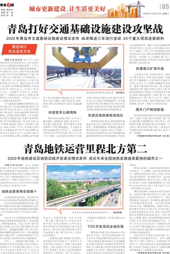 聚焦项目落地,TOD重点项目加速布局。2022年实施TOD项目19个,其中,地铁集团投资13个,各区市投资6个。坚持顶格推进、条块结合、协调联动,推动各项工作取得突破性进展。全年累计取得4300亩土地一级整理资格。地铁2号线辽阳东路站万象汇8月底开业,所在区域已打造成为涵盖住宅、商业、酒店、办公等多重业态聚集的高端TOD项目。同时,青铁云上观澜、青铁·封华地等新建TOD项目成功入市,预计年投资额逾57亿元。力争三年内在全市启动21个TOD重点项目,让更多人乘坐地铁出行,让更多人工作生活在地铁旁,推动青岛TOD模式成为全国城市更新的典范。