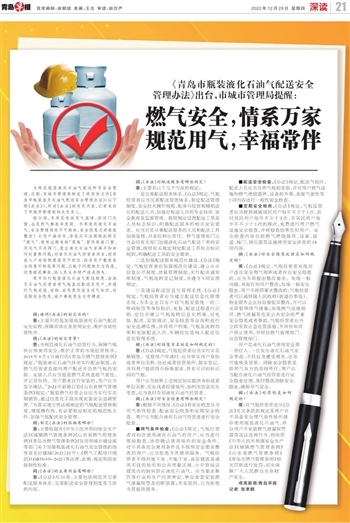 为规范瓶装液化石油气配送环节安全管理,近期,市城市管理局制定了规范性文件《青岛市瓶装液化石油气配送安全管理办法》(以下称《办法》),针对《办法》的有关内容,记者采访了市城市管理局相关负责人。