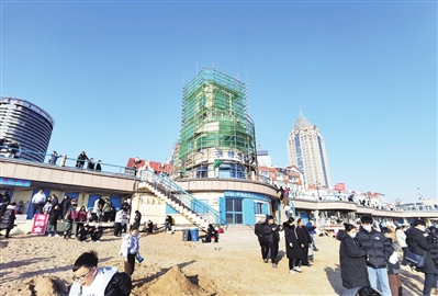 30日下午,早报记者在栈桥海水浴场看到,沙滩及观景平台上的游客很多,标志性的钟表楼四周已经搭起了脚手架,施工人员正在布置施工防护网,观景平台的部分人行道也对游客增加了安全隔离护栏。施工现场张贴了工程说明,从1月28日起,对栈桥海水浴场整治提升,进行钟表楼改造,以及加固18至24号更衣室。