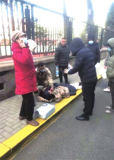 在现场,杨城脱下军大衣垫在老人身下,用力掰开老人嘴巴,让老人咬住他的手指,并用力掐住人中穴。经过一番紧张的救治,老人逐渐恢复意识,杨城同附近的社区工作人员一起把老人送往医院,然后才默默离开。