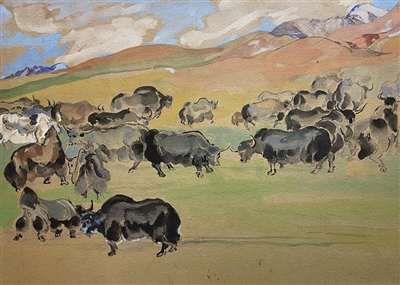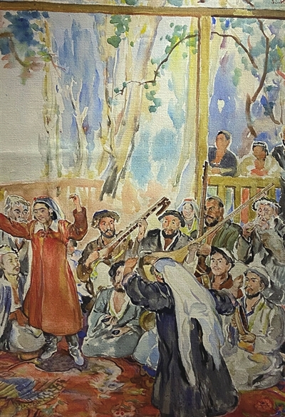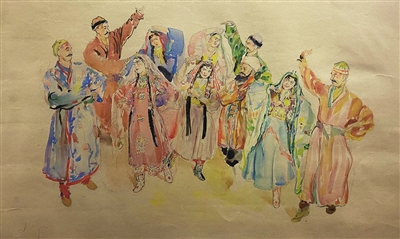 1943年,司徒乔随西北视察组深入新疆写生,百年积雪的天山、一镜映空的天池、戈壁的浩瀚黄沙、冰湖的琉璃世界,还有婀娜多姿的舞者、织地毯的工人、女教师、打铁匠、放牧、搬家、婚礼、叼羊、制乳酪、赶集和他们的驼群、羊群、马群、牦牛等一切风物人情都成为了他笔下的素材。这些描绘新疆风俗民情的水彩作品,记录与还原了20世纪40年代新疆社会发展的真实图景。司徒乔始终将目光与画笔对准社会底层百姓,以至真至纯的人性良知与艺术理想表达着对普通民众的关爱,作品饱含着爱与激情,深刻反映了人民生活和社会苦难。