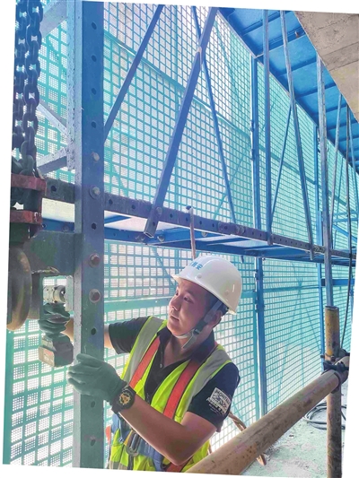 “作为建筑工地必不可少的部件,脚手架的搭设要求非常高,不能有丝毫马虎。”孔德智介绍,一名熟练的架子工每天经手的钢管有四五十根,站在高处,架子工要手握钢管,并将其准确无误地搭建好,拧紧扣件。“最近因为天气炎热,我们在工地的工作时间进行了调整,每天早上6点上班,先进行必不可少的安全教育,然后赶紧趁着还凉快些工作到上午10点半左右,温度升上来后会休息,下午大约从3点再干到六七点,夏天天气多变,但我们必须掐着点干,一点儿也不能耽误进度。”孔德智说道,他的工作因需要高空作业属于特殊工种,尤其在空中时感觉离太阳更近了,再加上精神必须高度集中,难免出汗更多,每天收工时全身都像从水里捞出来一样。“出汗、闷热,其实所有工种的工友们都一样,大家都习惯了。虽然辛苦,但坚守工地把好工程质量关是我们的本分。”孔德智说。