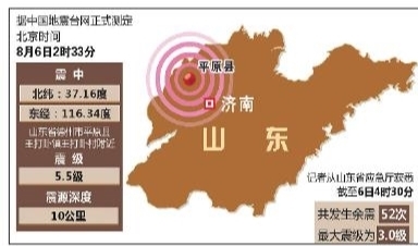 据中国地震台网正式测定,8月6日2时33分在山东省德州市平原县(北纬37.16度,东经116.34度)发生5.5级地震,震源深度10公里。震中位于平原县王打卦镇王打卦村附近。