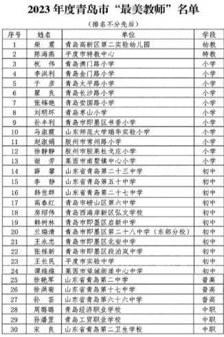 早报9月4日讯 9月4日,青岛市教育局公布2023年度青岛市“最美教师”和“教书育人楷模”选树结果。经个人申报、基层推荐、专家评审,评选出柴震等30名青岛市“最美教师”和招霞等34名青岛市“教书育人楷模”。