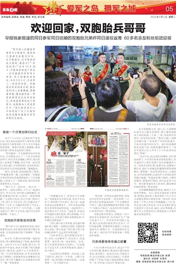 “原中国人民解放军陆军中士陈裴宇、陈泉洲已圆满完成服役任务。长子陈裴宇、次子陈泉洲返乡报到,请指示!”“欢迎回家!”去年10月28日,早报独家报道了青岛一对双胞胎兵哥哥同日参军、同日结婚的消息后,今年9月4日,兄弟两人一同退役回家。双胞胎兵哥哥的亲友团、粉丝团60多人拉着横幅、挥舞着国旗,像迎接明星一样在铁路青岛北站欢迎他们,其他旅客看到这个场景后,也纷纷加入欢迎团队中。“他们就是我们心中的明星!”专门从城阳赶来迎接双胞胎兵哥哥的粉丝王超说。