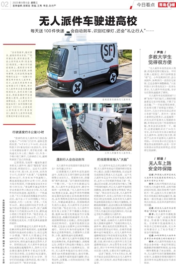 “自动驾驶中,随时停车,请保持两米车距。”“倒车请注意,倒车请注意。”在山东科技大学(青岛校区)校园里,一辆小车行驶在道路上,遇到前方有学生,小车会自动刹停,如果有路障,它则会机智地拐弯绕行过去……这辆小车便是顺丰的无人派件车。近日,记者从青岛顺丰速运有限公司了解到,顺丰无人派件车正在完善道路规划设计,向有关部门报备后,将在岛城的市区道路投入使用,主要应用于海鲜运送。无人派件车的性能如何?如何保障行驶安全?9月5日,记者来到山东科技大学(青岛校区),探访无人派件车的使用情况和背后的安全性。