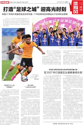 在15个“十四五”期间全国足球发展重点城市中,青岛于2022年11月第一个专门出台相关建设方案。如今,青岛在打造“全国足球重点城市”方面取得阶段性成果:青岛海牛重返中超后时隔21年再度晋级足协杯四强;西海岸女足成功冲甲使青岛在17年后重返女子足球职业联赛。