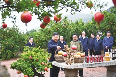 9月24日下午,在返京途中,习近平在山东省委书记林武和省长周乃翔陪同下来到枣庄市考察。枣庄是我国石榴集中连片种植面积最大、品种最多、产业链最完整的地区之一。习近平来到位于峄城区的冠世榴园石榴种质资源库,察看石榴树种,了解当地石榴种植历史、种质资源收集保存和产业发展情况,并来到石榴种植园中向老乡们询问今年石榴种植、收获和收入情况。得知当地大力发展石榴深加工和石榴盆栽培育有力带动了农民增收,习近平很高兴。他指出,人们生活水平在提高,优质特产市场需求在增长,石榴产业有发展潜力。要做好品牌、提升品质,延长产业链,增强产业市场竞争力和综合效益,带动更多乡亲共同致富。祝乡亲们生活像石榴果一样红红火火。