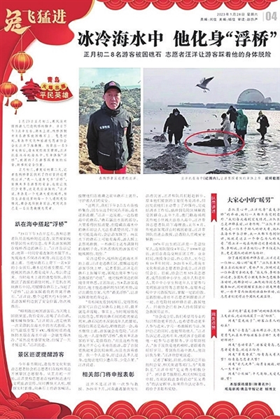 大年初二(阳历1月23日),栈桥西侧有8名游客被困礁石上。危急时刻,青岛市文化和旅游志愿者协会会长汪洋下海救援,他背出一名9岁女孩后,用身体做“浮桥”,帮助其他7名游客安全转移。他的举动感动了无数市民和网友。昨天,汪洋在接受记者采访时称,未来他将继续在栈桥边站好岗,守护着游客的安全。