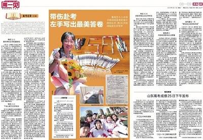 韩诗雨的事迹经过早报报道后引发强烈反响,央视新闻、光明网等多家央媒纷纷转发报道。“不服输、不放弃,努力就会创造奇迹!”央视新闻视频平台的标题这样描述韩诗雨的励志故事。“考前30天右手肌腱断裂,右撇子女生双手交替完成高考。”光明网的转载内容中,最后一句话“只要相信自己,自己就是奇迹”,被众多网友转发点赞。