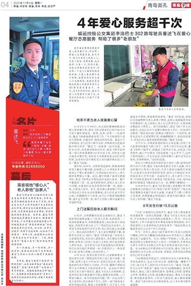 董述飞在青岛城运控股公交集团李沧巴士302路车上服务了8年,安全行驶里程超15万公里,以零违章、零事故、零责任投诉展现出了自己的专业素养。作为车辆“掌舵者”,董述飞全心付出,成为乘客心中的“暖心人”,大家亲切地称他“小董师傅”。
