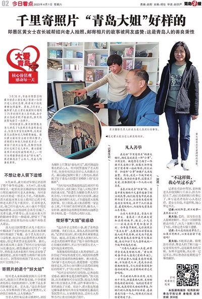 “这点举手之劳的小事,换了谁都会这样做。我们山东人、青岛人都会这样做的。”记者在采访时,黄绪红多次重复着这句话。她说,在长城上帮老人拍照片时,从老人的眼神里看出了他十分珍惜这次在长城拍的照片,所以当时就答应老人一定冲洗出来寄给他。