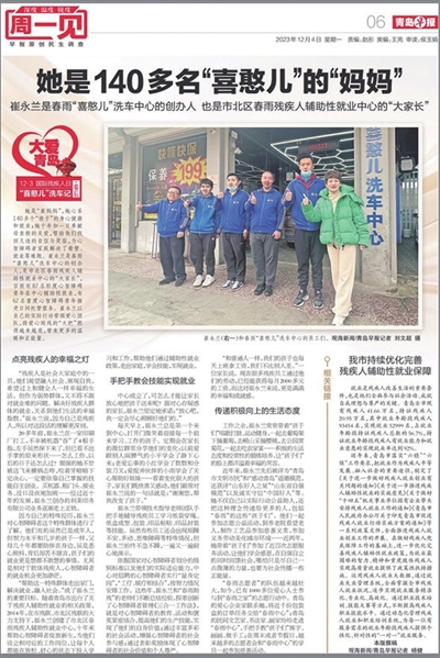 2023年10月21日,青岛市第一家专为心智障碍者提供就业机会的洗车店——春雨“喜憨儿”洗车中心开业。一个多月时间,培训上岗的8名“喜憨儿”洗了300多辆车,他们走出家庭,迈向社会,实现就业,实现人生价值。12月3日国际残疾人日前夕,记者走进春雨“喜憨儿”洗车中心探访,倾听“喜憨儿”们共同的妈妈崔永兰讲述她几十年来用爱心创造奇迹的故事。