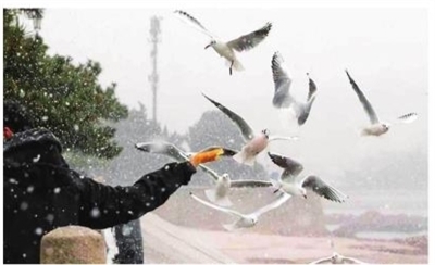 每到冬季,栈桥上人鸥和谐共舞的图景已经成为青岛的一张城市名片,翩翩飞舞的海鸥,给青岛的冬天增添了一抹亮丽的色彩。