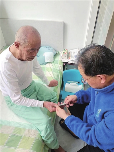 “你来啦,从昨天起老伴儿就盼着你来。”早上还不到8点,万林集团居家照护师李忠令已经赶到了位于市北区的第一户老人家中,今年72岁的黄大叔常年卧病在床,照顾老人的任务全都落在老伴身上。李忠令被亲切地招呼进屋,熟悉地问候两位老人。黄大叔自从签约“万林家护”、被评定为3级失能后,每周都可以得到一次居家护理服务,这也成为了二老每周最期盼的时刻。
