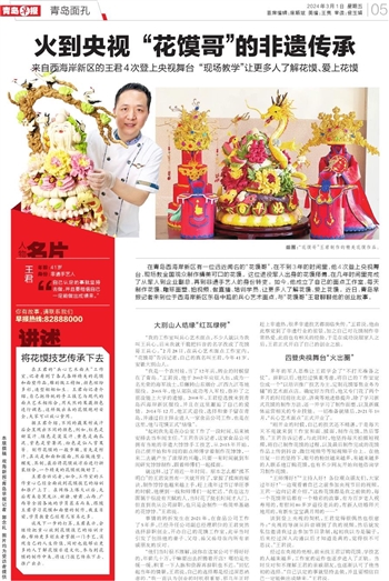 在青岛西海岸新区有一位远近闻名的“花馍哥”,在不到3年的时间里,他4次登上央视舞台,现场教全国观众制作精美可口的花馍。这位退役军人出身的花馍师傅,在几年时间里完成了从军人到企业副总,再到非遗手艺人的身份转变。如今,他成立了自己的面点工作室,每天制作花馍、雕琢面塑、拍视频、做直播、培训学员,让更多人了解花馍、爱上花馍。近日,青岛早报记者来到位于西海岸新区东岳中路的兵心艺术面点,与“花馍哥”王君聊聊他的创业故事。