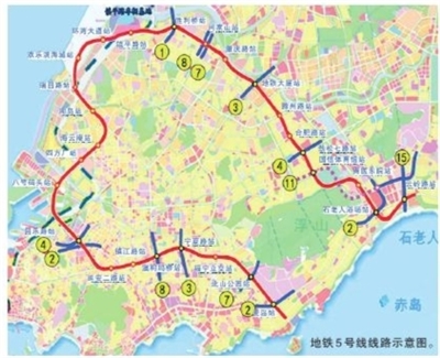 青岛地铁5号线起于麦岛站,终于云岭路站,长约32.6公里,共设27座车站,其中有12个车站为换乘站,可与8条轨道交通线路换乘,与城区既有地铁线网均有交叉,定位为大运量等级的骨干线路。