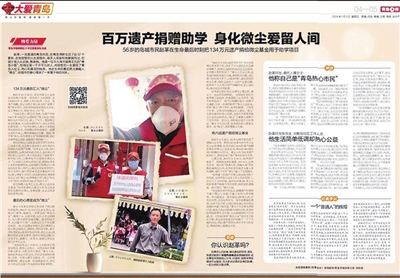 赵革最后的时间是在病床上度过的,黄女士一边在医院照顾他,一边替他忙前忙后考察公益机构、申请遗嘱公证手续等。“最开始帮他选了一些可以捐赠的地方,他都不太满意,后来一名律师推荐了微尘公益基金,听到‘微尘’两个字时,赵革的眼睛一下明亮了许多。记得当时他躺在床上感叹,‘微尘’是青岛城市的爱心品牌,这些年经常看到微尘公益活动的消息;‘微尘’又寓意人就像大千世界中的一粒沙尘,特别贴合他个人的想法。”黄女士告诉记者,赵革最后的心愿就是成为一粒“微尘”,将骨灰撒入大海。