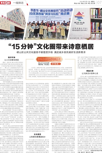 “图书馆是崂山区公共文化服务的重要主阵地,区委区政府高度重视图书馆建设和服务效能提升,2023年投入近200万元,对图书馆服务设施及馆藏文献等进行升级,为成功创建国家一级图书馆提供了很大的保障,我们的软硬件建设和服务效能也有了进一步提升,群众的阅读供给和服务更加完善。”江爱英说。