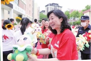 青岛市北区实验初级中学2024届中考壮行仪式上,校长丁台会为每名考生送上鼓励寓意“棒棒”的棒棒糖,为初三班主任们赠予象征“一举夺魁”的花束,考生们穿过“必胜门”,喊出班级口号,豪迈的誓言点燃了心中奋进的火焰,坚定了冷静迎战、再创辉煌的决心。
