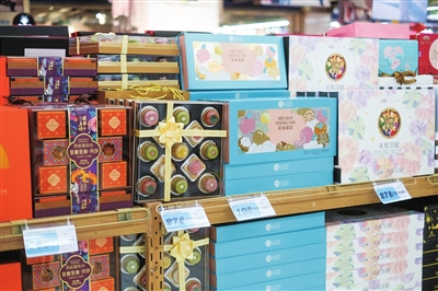 记者在崂山区某大型线下商超内看到,商场入口处已经开辟出月饼专区,摆满了各种月饼礼盒,引得消费者纷纷驻足选购。