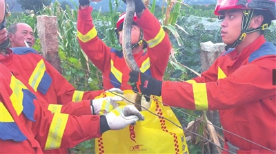 救援人员首先对现场人员进行疏散,避免蛇在惊慌中逃窜或攻击人。随后迅速穿戴好防护装备,根据村民指引,在果园的葡萄藤旁边,发现被果园防鸟网缠住的1条长约2米的蛇。由于被网缠绕,蛇无法动弹。征求果园主人同意,消防员使用剪刀将缠绕蛇身的防鸟网一点点剪开,将蛇捉住,然后带到野外放生。经询问报警人得知,当时在果园听到有异响,上前查看发现这条蛇被防鸟网缠住,不敢擅自处置于是报警求助。