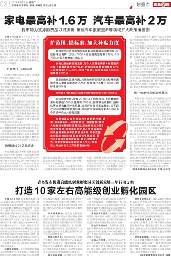 早报9月2日讯 创业孵化基地(园区)是落实创业政策、开展创业培训、提供创业服务的重要阵地。近年来,青岛市在创业孵化载体建设方面取得一定成效,目前青岛市共认定市级及以上创业孵化基地(园区)16家,其中,国家级创业孵化示范基地2家,省级创业孵化示范基地(园区)11家。全市创业孵化基地(园区)累计孵化创业实体8000余家,带动就业4.2万人。近日,青岛市发布《青岛市促进高能级创业孵化园区创新发展行动方案(2024—2026年)》,着力打造推动创新创业的新型孵化模式,拟在全市现有创业孵化基地基础上升级打造10家左右高能级创业孵化园区,通过十大举措予以扶持,全面提升创业孵化园区建设水平。