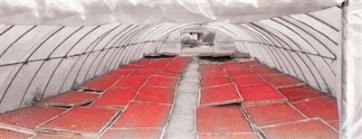 待记者下午再去查看时,发现棚子的塑料布也已经被拆掉了,几十板枸杞正在散发水分和气味,等待进入旁边的大棚进行晾晒。