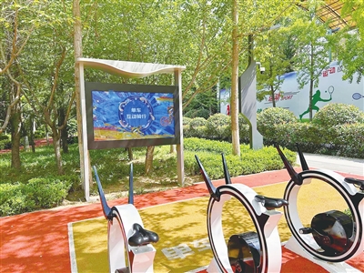 不仅如此,这里还藏着“宝藏”智慧运动设施——AR单车互动骑行,几辆黑白相间的动感单车设计简约而科技感十足,单车与智慧屏幕系统相通。记者骑上单车,踩动单车踏板后,面前的屏幕便显示出AR人物沿路骑行的画面,同时有时速、公里等数据,随着自己骑车的速度变化,屏幕上的人物也同步调整着速度,周边景色不断变换,趣味盎然的骑行将运动的快乐值瞬间拉满。如果环视周边实景,也不失为一种视觉享受,成片的银杏林已微微泛黄,晴空之下更添几分明媚。