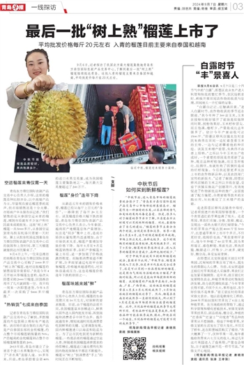 青岛东方鼎信国际农副产品交易中心负责人介绍,这里的榴莲品种比较齐全,以中高端产品为主,尽管现在接近榴莲季的尾声,但市场销售还是十分火爆。市场商户辛永强告诉记者,“我们销售的是从泰国空运来青的榴莲,刚到市场就有不少客户和市民前来成箱批发。这批‘树上熟’榴莲一共5000多斤,从泰国空运到青岛胶东机场只需要一天时间。算上从胶东机场运到青岛东方鼎信国际农副产品交易中心后的装卸和上货时间,第三天榴莲就能到达市民餐桌了。”