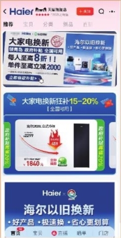 领取优惠券后,市民可登录家电企业的线上店铺。以海尔智家为例,进入到海尔智家在淘宝、京东开设的官方旗舰店。例如在淘宝APP搜索“海尔官方旗舰店”,进店即可看到以旧换新专区,点击进入,找到相应产品下单,使用云闪付支付即可立享补贴减免。