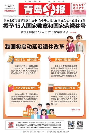 根据国务院放假安排,本报9月15日(农历八月十三)至9月17日(农历八月十五)休刊,9月18日(农历八月十六)恢复出刊。休刊期间,早报热线82888000保持24小时畅通,青岛早报微信公众号、新浪微博、抖音号、视频号、头条号等全媒体矩阵也将与读者即时互动,为大家奉上及时全面、贴心实用、丰富多彩的权威新闻和内容资讯。青岛早报编辑部