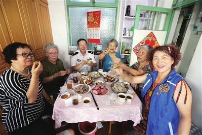 马怀龙、王德亭和志愿者们坐在一起有聊不完的话题。“他几点到老人家里,老人家就几点过节,喝完一杯酒,吃几口饭,聊几句家常,这个节也就算过完了。”马怀龙金盾志愿服务团队的志愿者小陈说。
