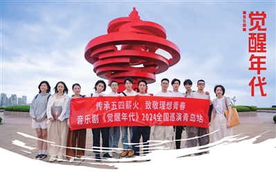 中秋节假期,革命历史题材音乐剧《觉醒年代》巡演至青岛,于9月16日、17日在青岛大剧院进行了两场演出。该剧生动刻画了从新文化运动到中国共产党成立这一重要历史时期,无数革命先驱投身国家救亡图存,百折不挠、英勇不屈的奋斗历程,同时也为该剧2024年度的全国巡演画上了圆满的句号。作为五四运动的策源地,青岛对音乐剧《觉醒年代》的主创团队而言具有着特殊的意义,演出前他们特地来到五四广场,站在《五月的风》雕塑前,回想当年的峥嵘岁月与无数革命志士的英勇奋战,感慨良多。